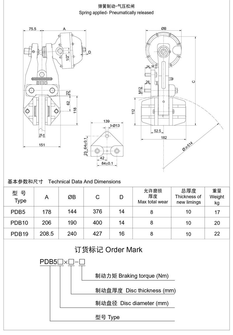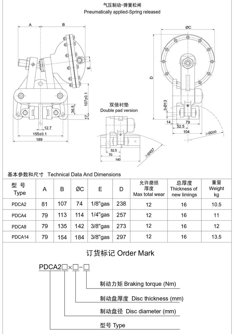 ■氣源要求:通入氣包的壓縮空氣應(yīng)干燥、潔凈,不能含有腐蝕性氣體?!霭惭b方式:適合于水平軸或垂直軸制動(dòng)方式。水平軸制動(dòng)方式時(shí),可沿制動(dòng)盤(pán)周?chē)我饨嵌劝惭b,但最好是水平安裝;垂直軸制動(dòng)方式時(shí),角度不限。一個(gè)制動(dòng)盤(pán),可安裝一臺(tái)制動(dòng)器,也可?安裝兩臺(tái)或兩臺(tái)以上制動(dòng)器,但安裝兩臺(tái)或兩臺(tái)以上時(shí)建議盡量對(duì)稱(chēng)安裝。